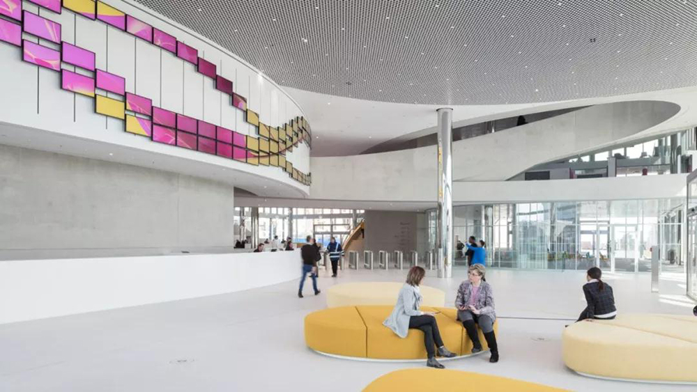 “灵感墙(InspirationWall)”是一个可交互的空间动态艺术装置,位于德国默克(Merck)创新中心大厅内,整个装置由72块移动的屏幕组成,并且装置运动的频率会受到当天客流量的影响,当越来越多的人穿过大厅时,装置舞动的频率会增加,反之,随着游客人数减少,装置的舞动会逐渐平息。如此唯美场景,不禁让人联想,这是否会是未来办公空间的雏形?